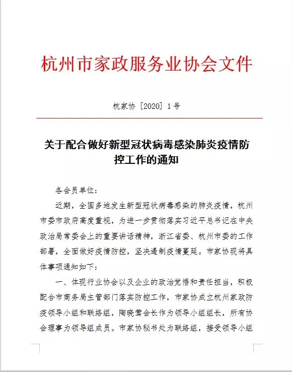 杭州市家協(xié)于1月28日成立了杭州家政防疫領(lǐng)導(dǎo)小組和聯(lián)絡(luò)組,積極配合市商務(wù)局主管部門落實(shí)防控工作,并要求會員企業(yè)做好健康情況自查統(tǒng)計(jì)。