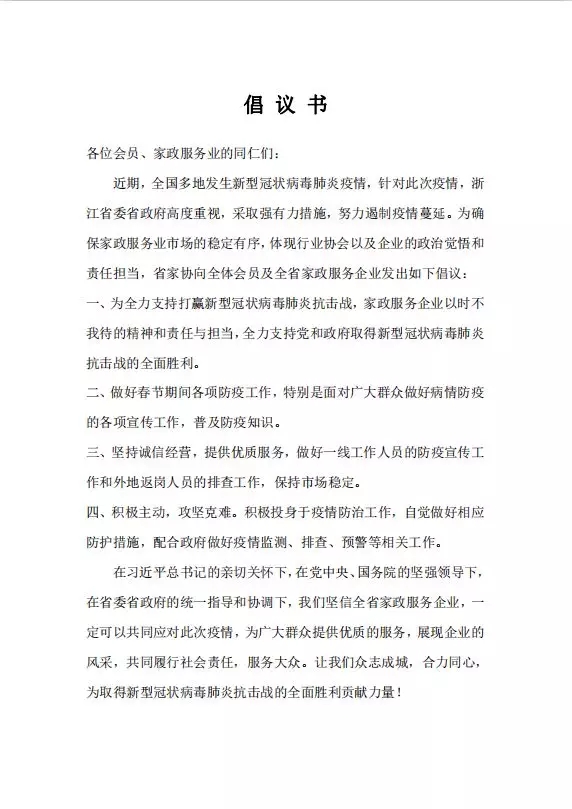 案,給當(dāng)?shù)仄髽I(yè)樹立榜樣。麗水市家協(xié)于1月25日就通知每一家會員企業(yè)負(fù)責(zé)人,篩查本企業(yè)是否有湖北籍或來自疫區(qū)的員工,并逐一通知,請其在疫情結(jié)束后再返回崗位,全市家政企業(yè)也都根據(jù)政府部門規(guī)定延遲了開業(yè)時(shí)間。