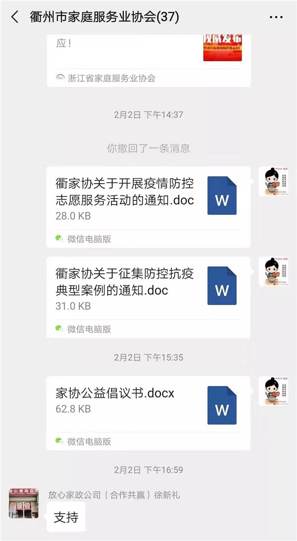 省家協(xié)副會長、衢州市家協(xié)會長單位,衢州半邊天家政服務(wù)有限公司第一時(shí)間采購大量的防護(hù)物資,及時(shí)發(fā)放,盡最大的努力保障在崗人員的身體健康,并對家政人員動態(tài)去向和健康狀況進(jìn)行了解核實(shí),嚴(yán)格篩查。羅姿會長表示從自身給行業(yè)做表率,堅(jiān)守誠信,禁止任何服務(wù)收費(fèi)漲價(jià)行為,積極與客戶溝通,妥善處理因疫情形成的業(yè)務(wù)調(diào)整,對客戶合理需求給予充分保障。衢州市家協(xié)也向全市企業(yè)和員工發(fā)出了《衢州市家庭服務(wù)業(yè)協(xié)會公益倡議書》以及《關(guān)于開展疫情防控志愿者服務(wù)活動的通知》,積極參與疫情防控。